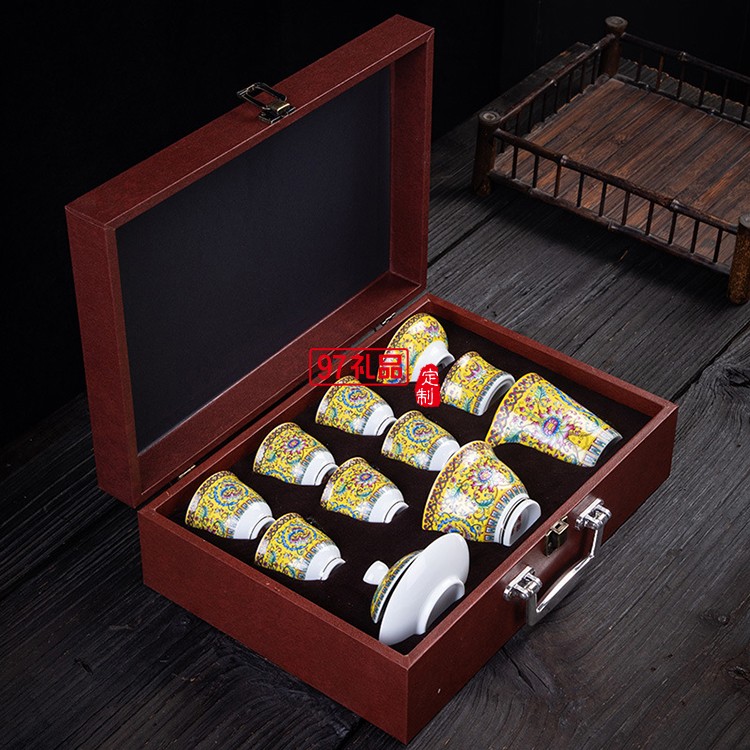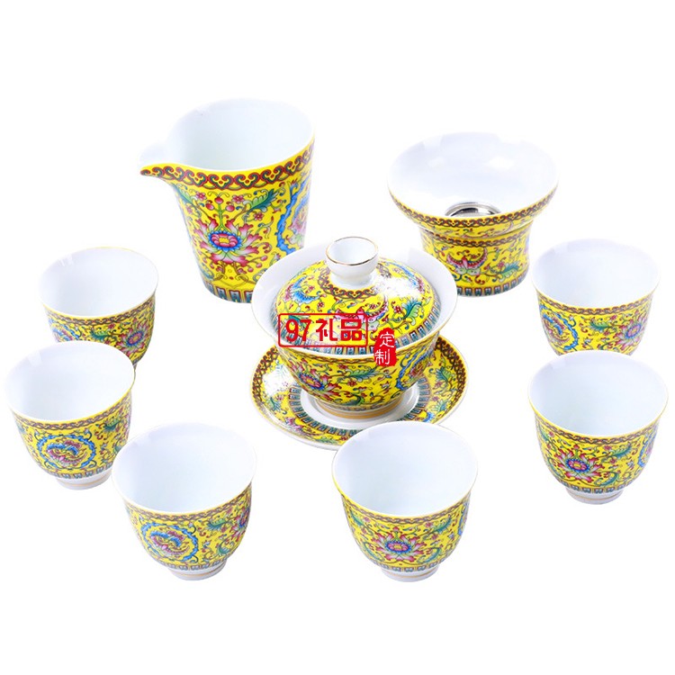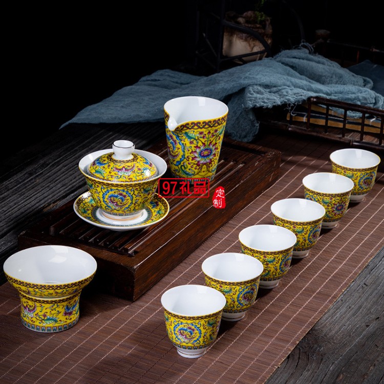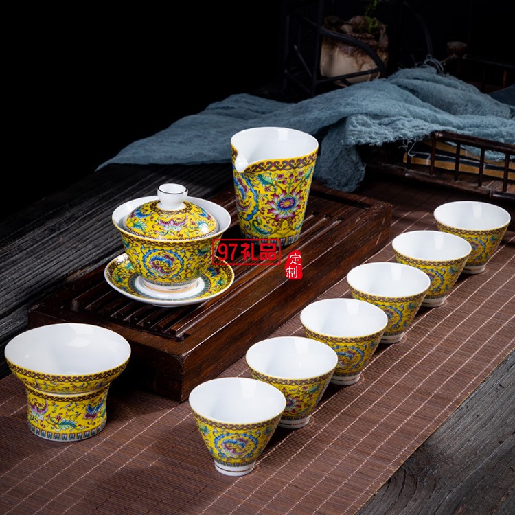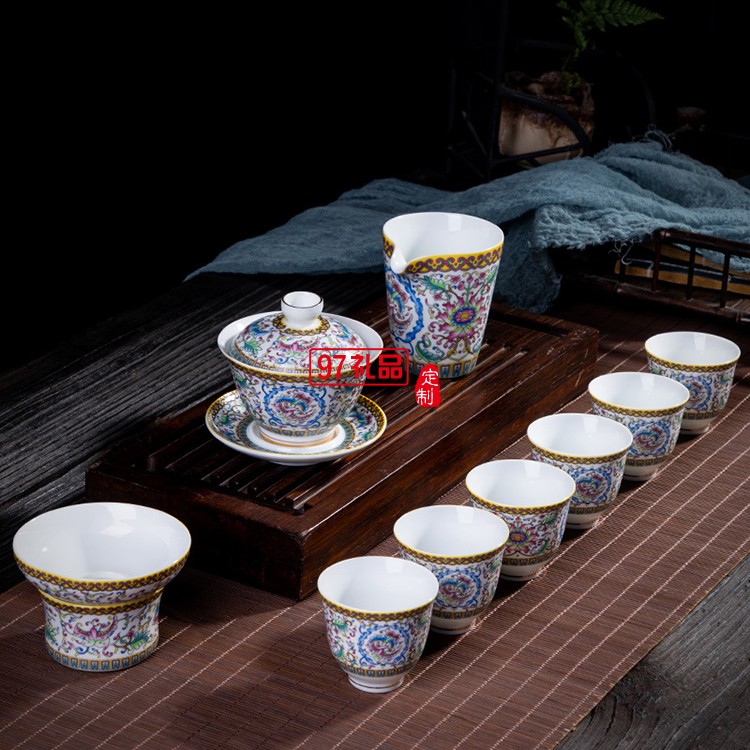 景德鎮(zhèn)琺瑯彩蓋碗茶具套裝陶瓷手工功夫茶具整套禮盒禮品定制LOGO