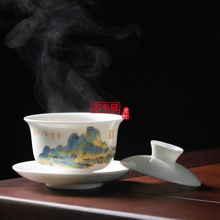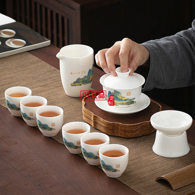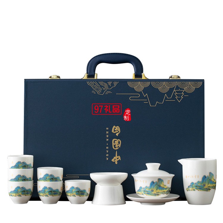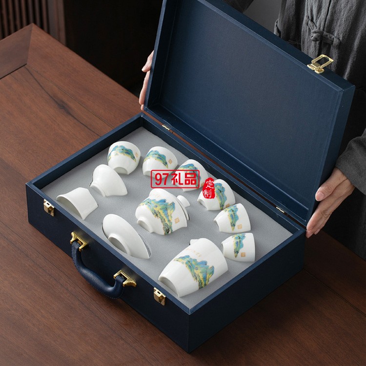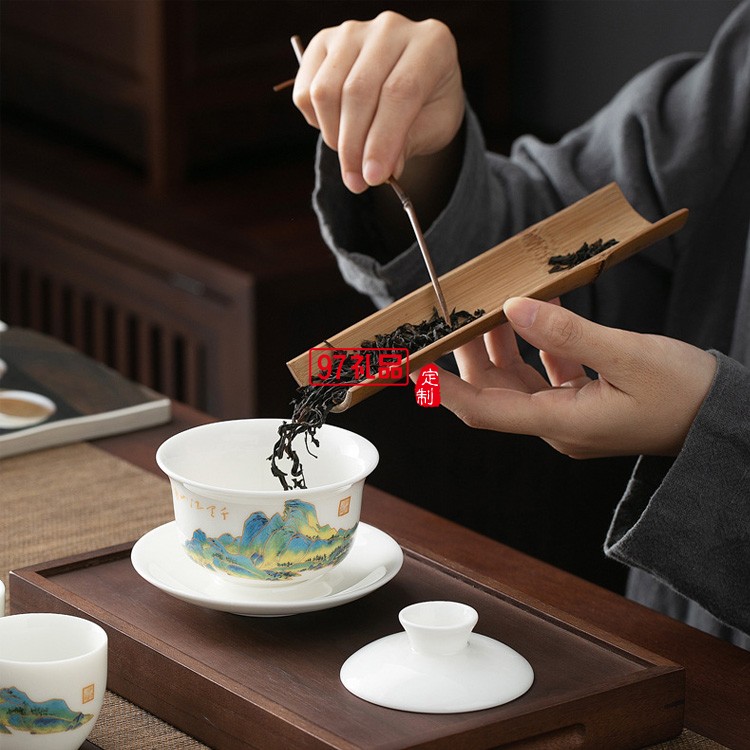 羊脂玉瓷功夫茶具套裝純白禮品定制千里江山整套禮盒禮品