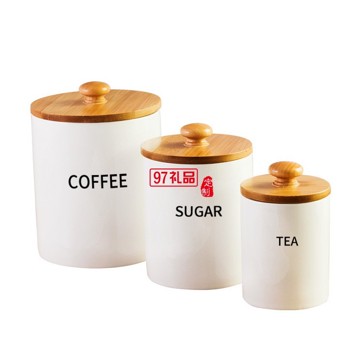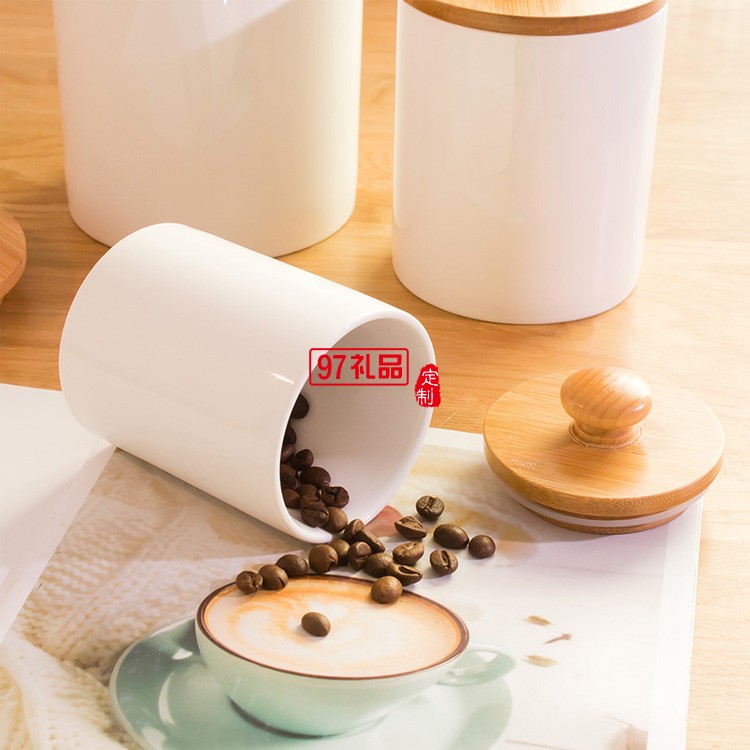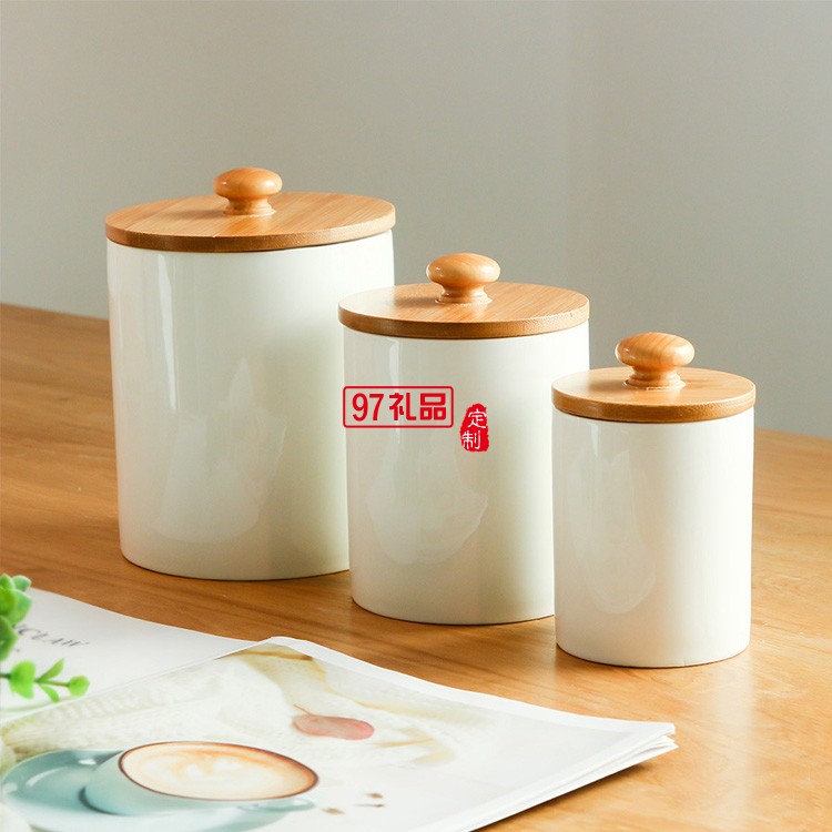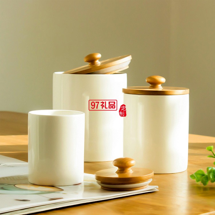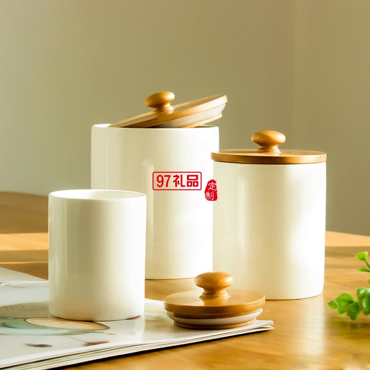 中式帶木蓋陶瓷茶葉罐小號(hào)白瓷迷你密封儲(chǔ)存罐圓形收納儲(chǔ)物罐