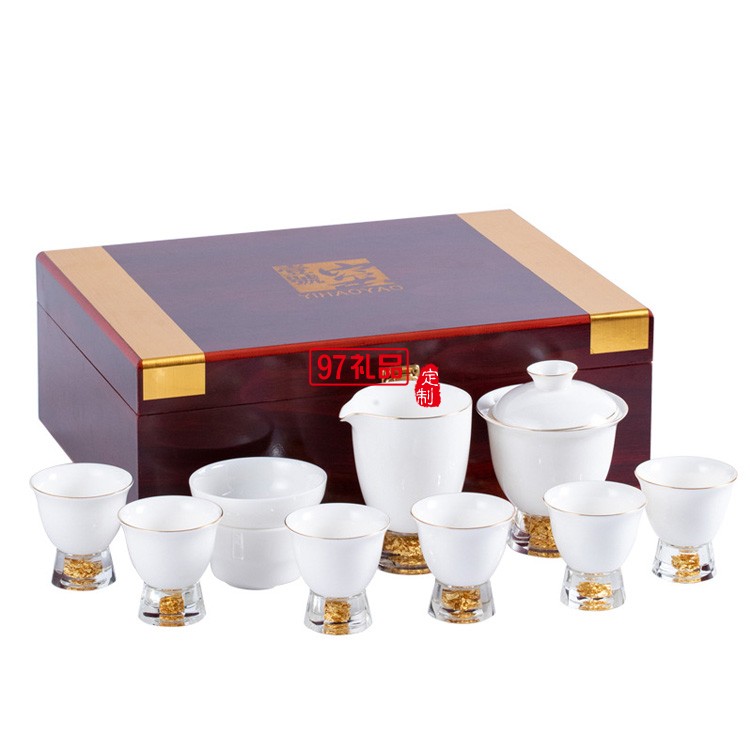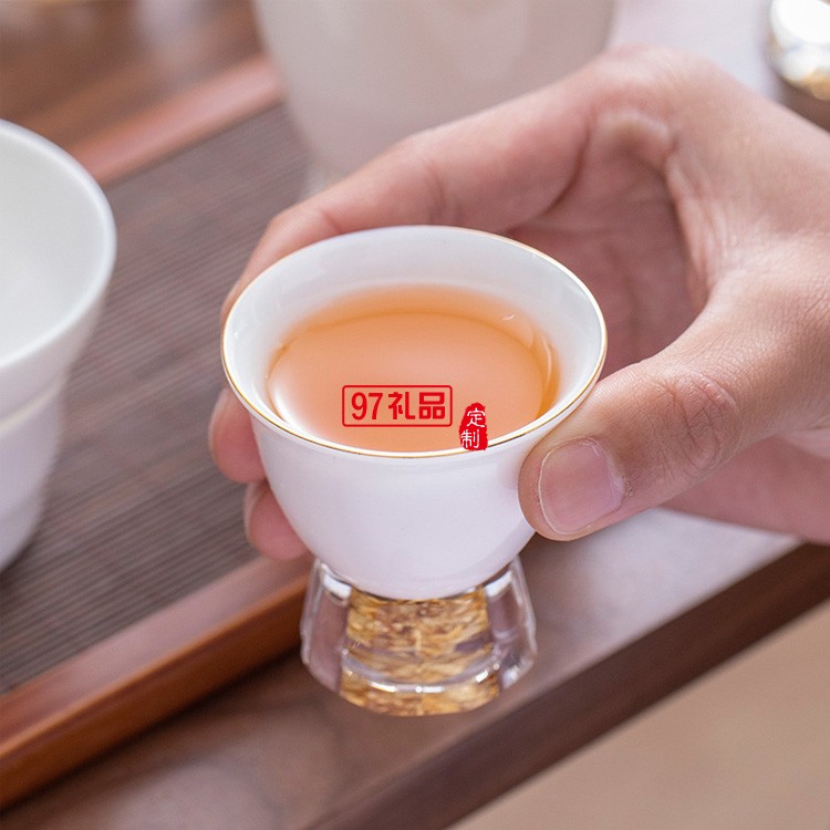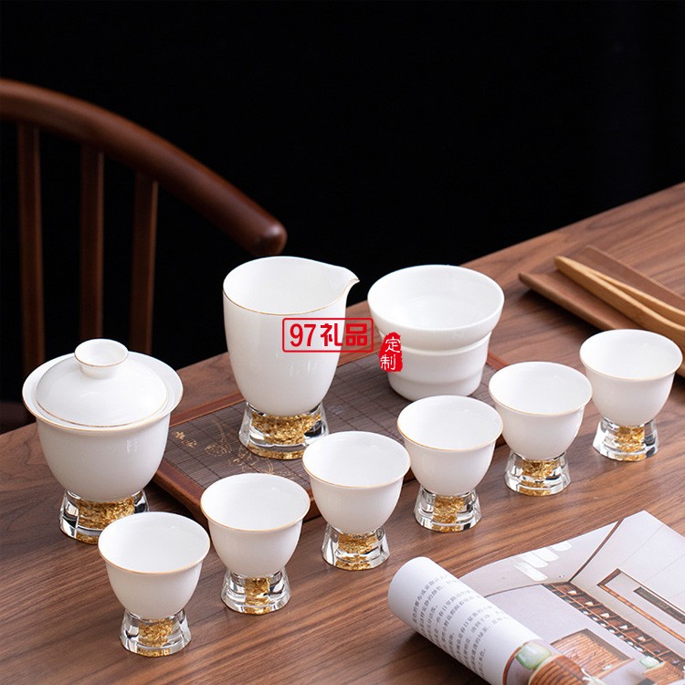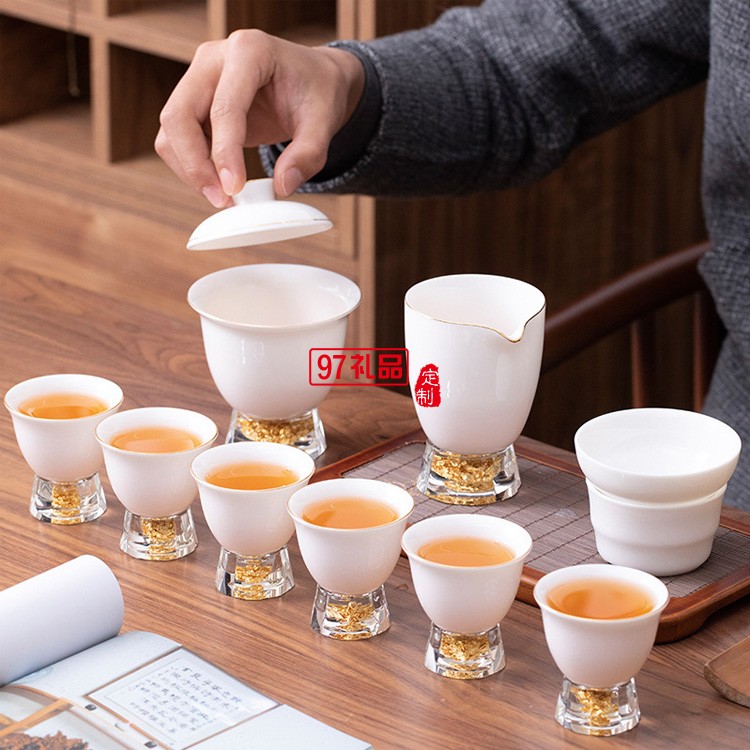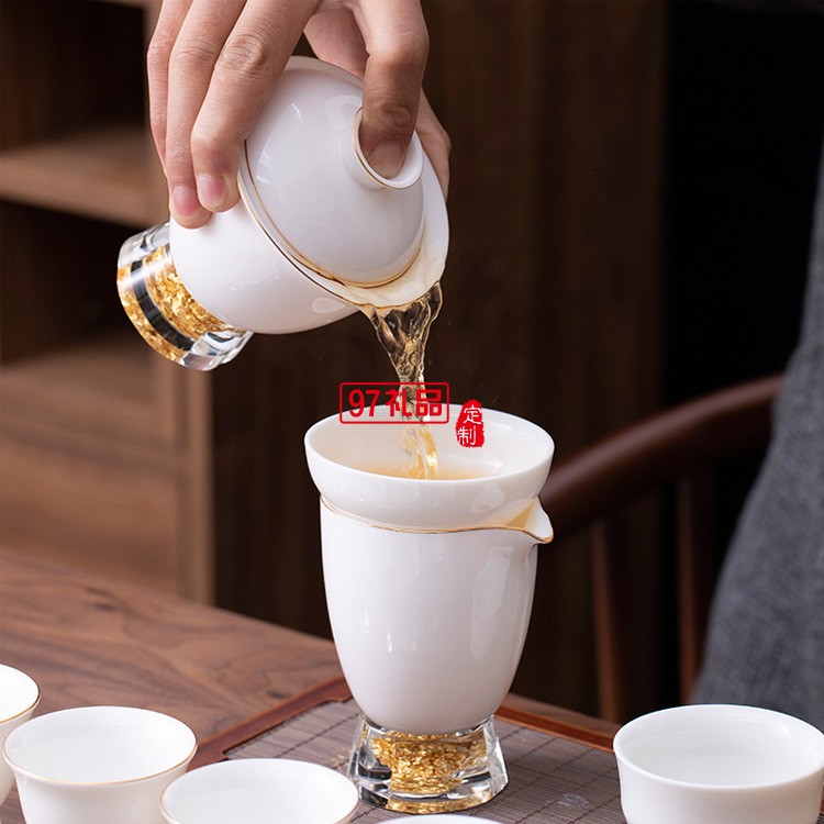 中式鎏金茶具套裝羊脂玉功夫茶家用整套高檔輕奢鎏銀蓋碗