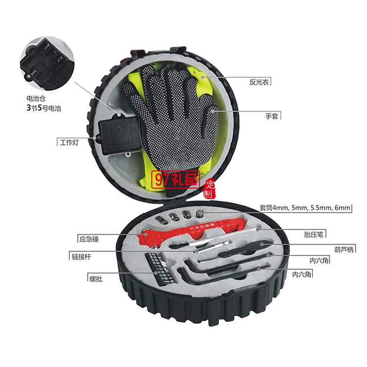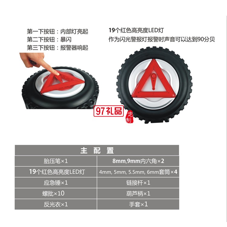 結(jié)構(gòu):4pcs套筒 1pc胎壓筆 1pc應(yīng)急錘 1pc葫蘆柄 1pc鏈接桿 1pc批條 2pcs內(nèi)六角工具 1pc反光衣 1pc手套 1pc閃光警報燈