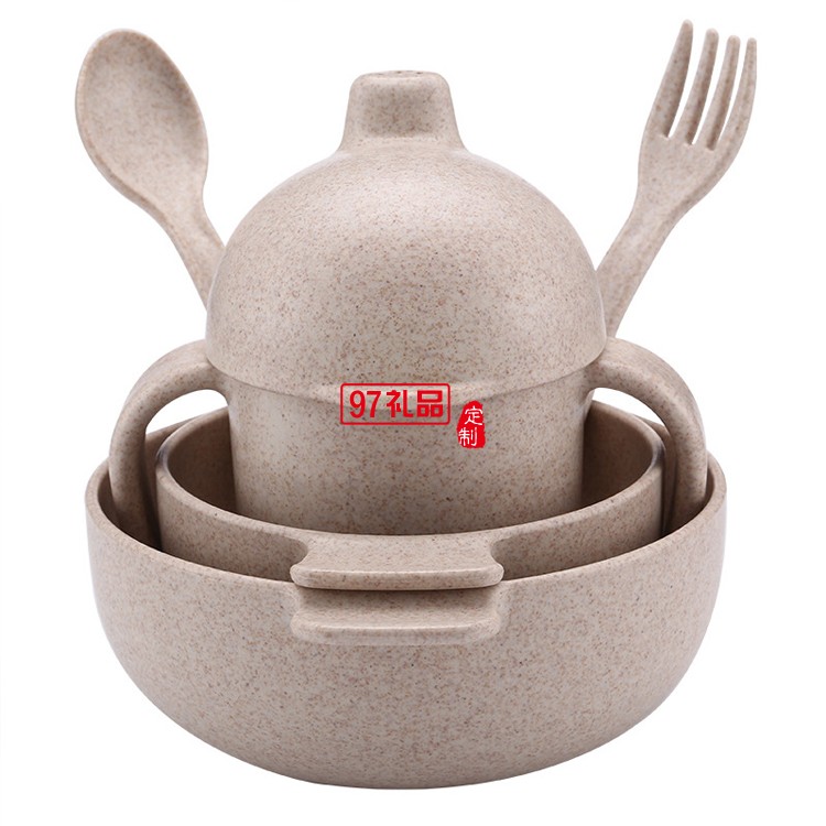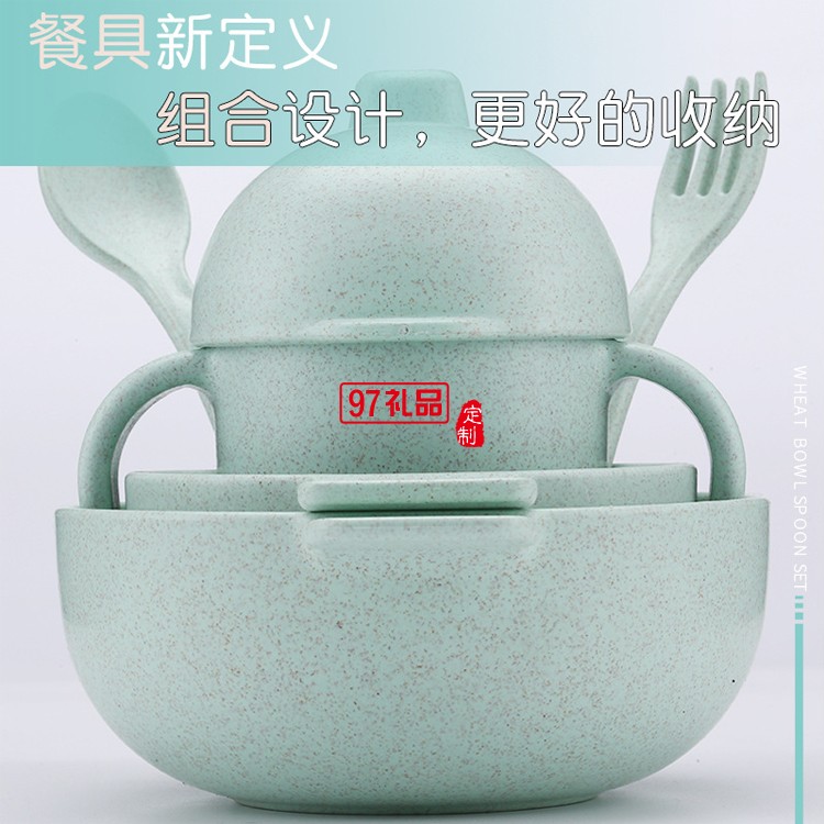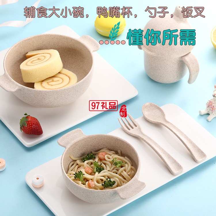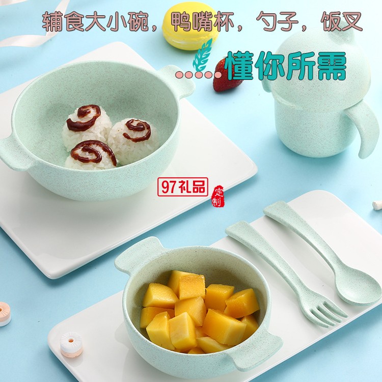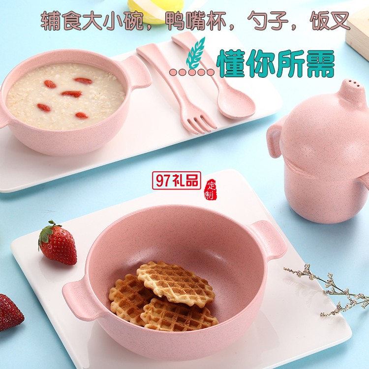 小麥秸稈碗勺套裝防摔防燙寶寶吃飯雙耳大碗兒童餐具