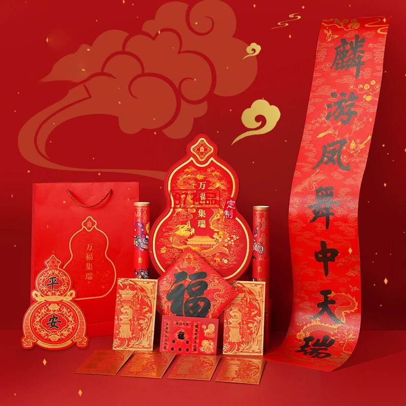 規(guī)格 1套( 春聯(lián)1對:大福字1;橫批1:小福字55;門神一對;冰箱貼1套;紅包*6;福祿春條*4; 窗花*2; 隔條組件1套;無痕點膠60枚: 葫蘆外盒1l; 禮品袋11)