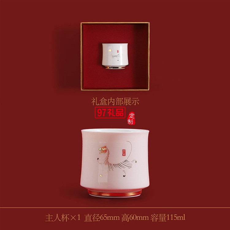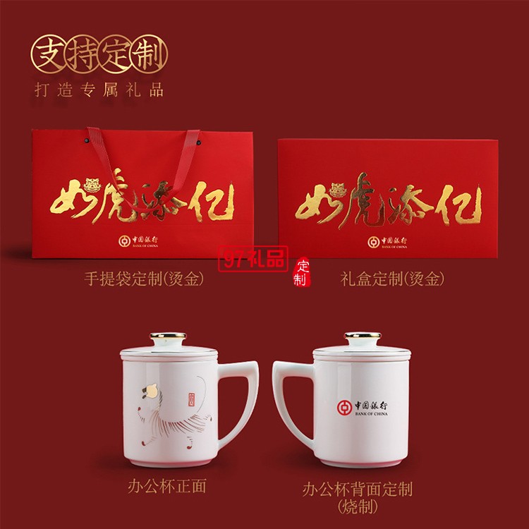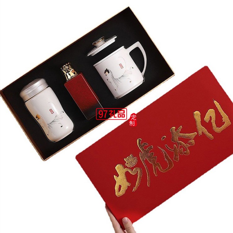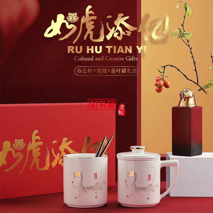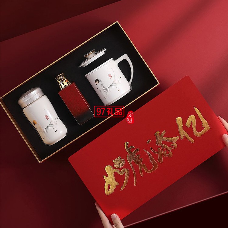 虎年開門紅陶瓷辦公杯商務(wù)禮品套裝新年賀歲快客杯禮盒裝密封罐茶