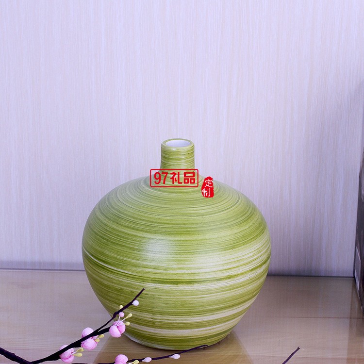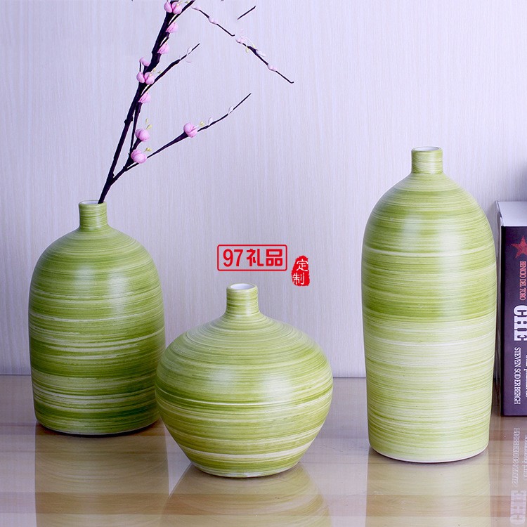 景德鎮(zhèn)陶瓷花瓶手工現(xiàn)代綠色螺紋陶藝裝飾工藝品擺件三件套