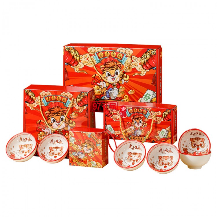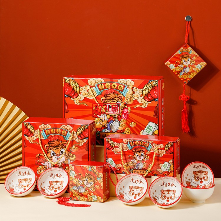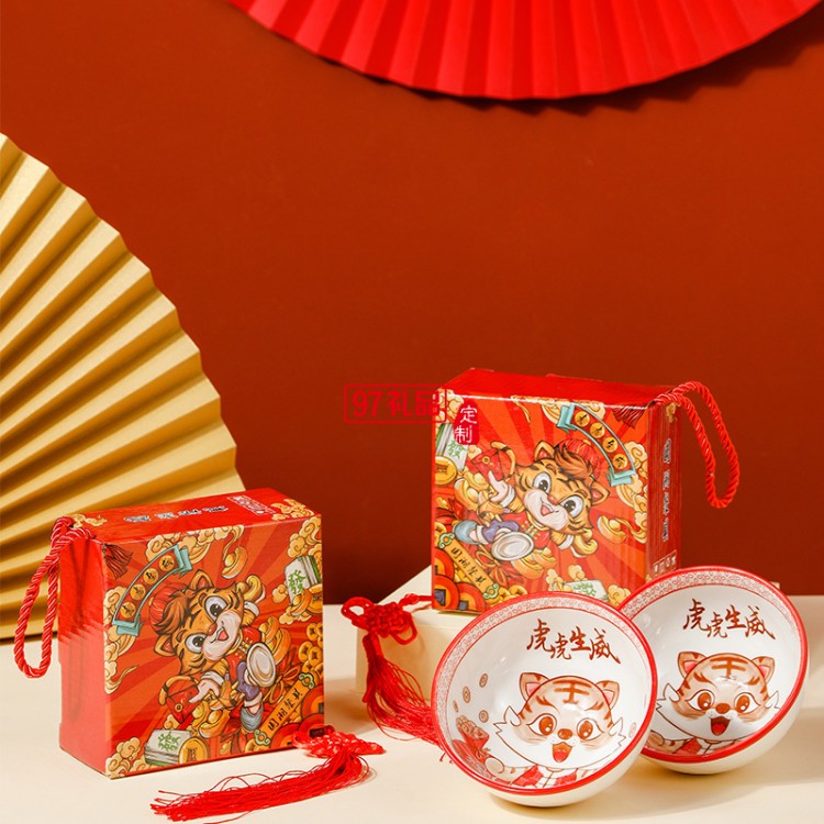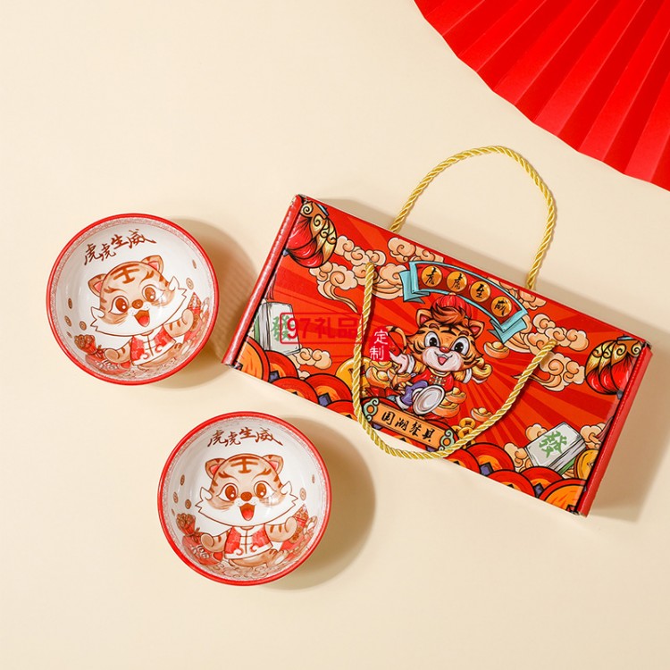 虎虎生威國潮陶瓷碗套裝活動(dòng)開業(yè)伴手禮虎年禮品碗陶瓷餐具禮盒裝