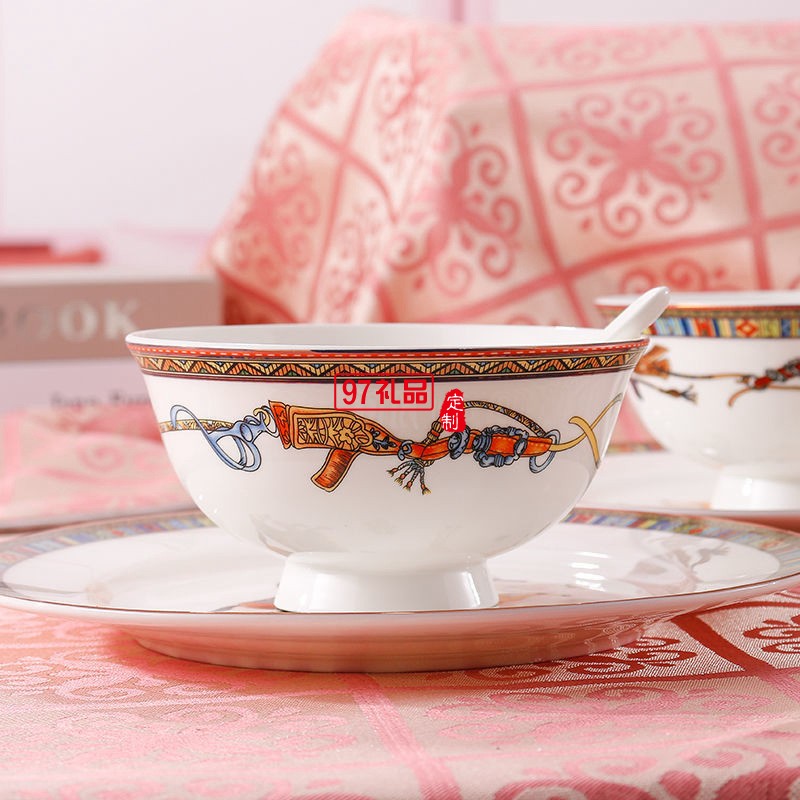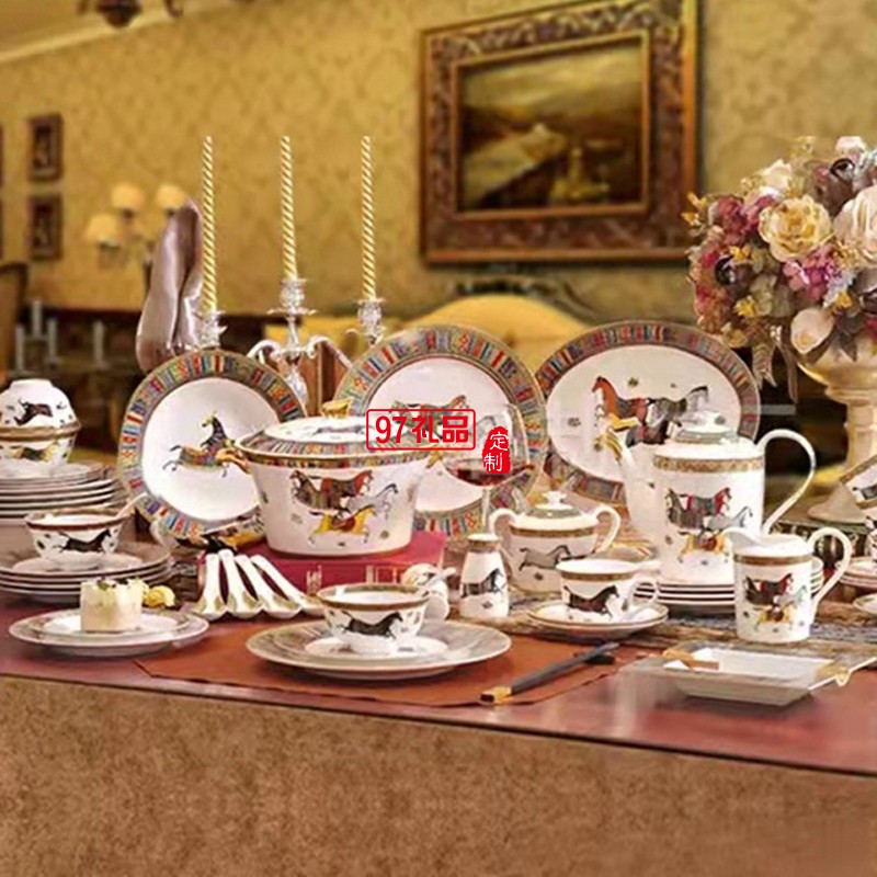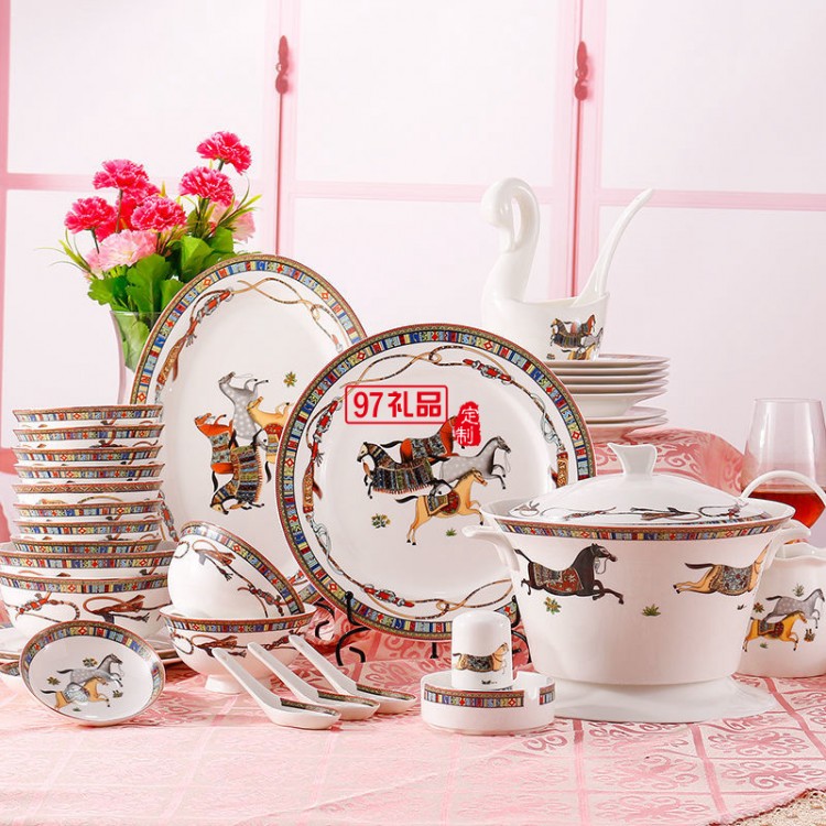 HERME愛馬60頭餐具套裝禮盒碗盤碟景德鎮(zhèn)骨瓷釉中彩陶瓷喬遷結(jié)婚