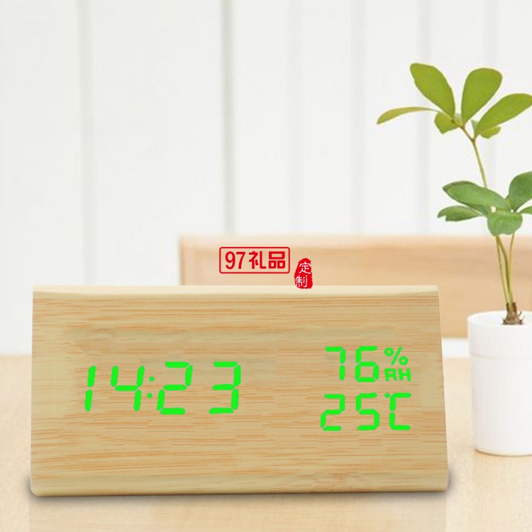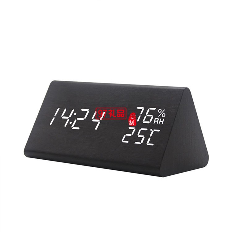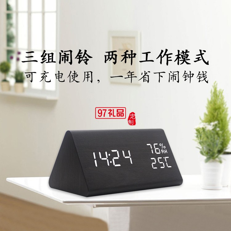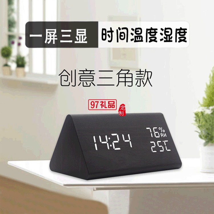 新款多功能溫濕度鬧鐘三角形木頭鐘電子鐘