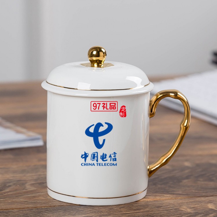 中秋國慶節(jié)禮品辦公會議杯帶蓋景德鎮(zhèn)陶瓷茶杯450ML明珠杯碟定制