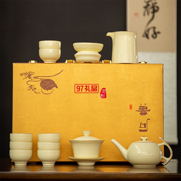 羊脂玉茶具套裝禮盒中式描金白瓷蓋碗泡茶壺茶碗客廳商用整套