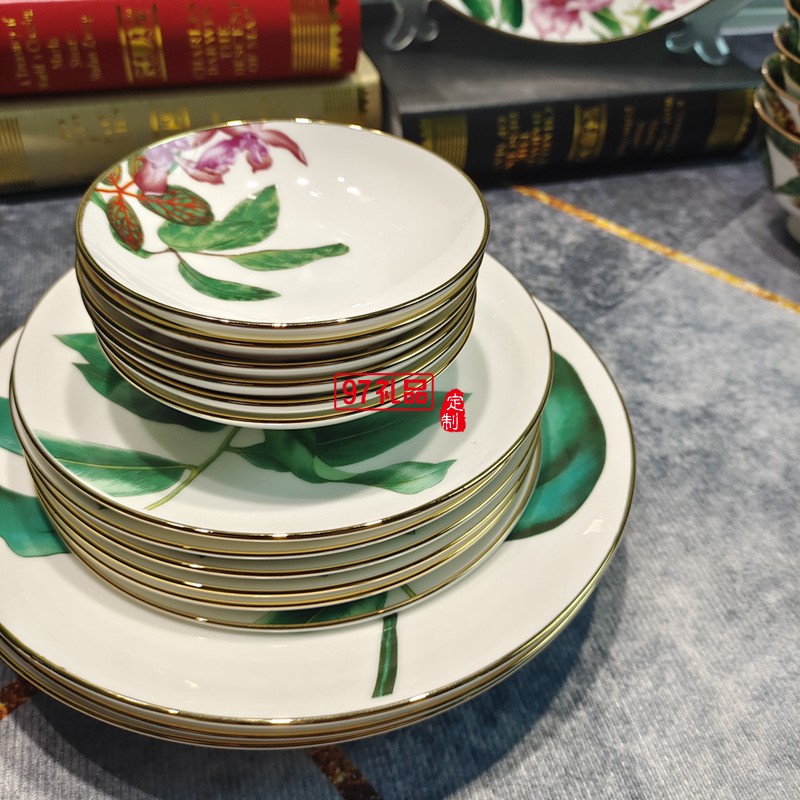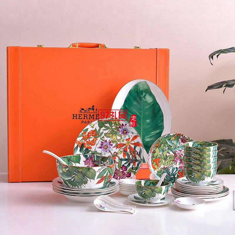 HERME愛馬歐式熱帶雨林系列36頭骨瓷餐具套裝禮盒描金中西式骨瓷