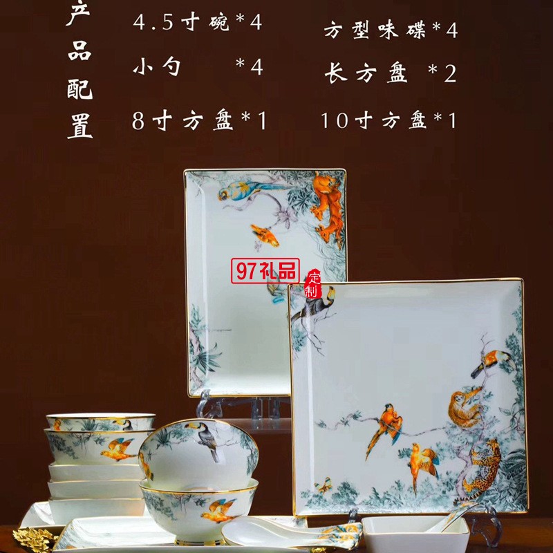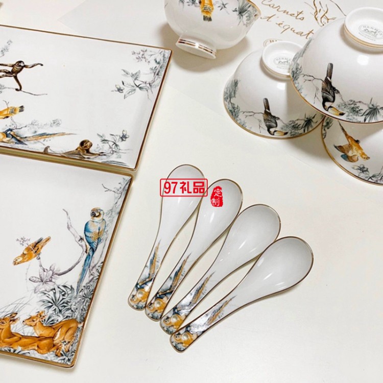 HERMES”愛馬16頭骨陶瓷鎏金餐具套裝赤道叢林系列方形盤碗碟勺禮