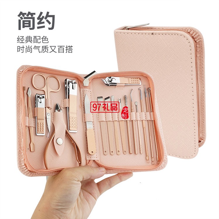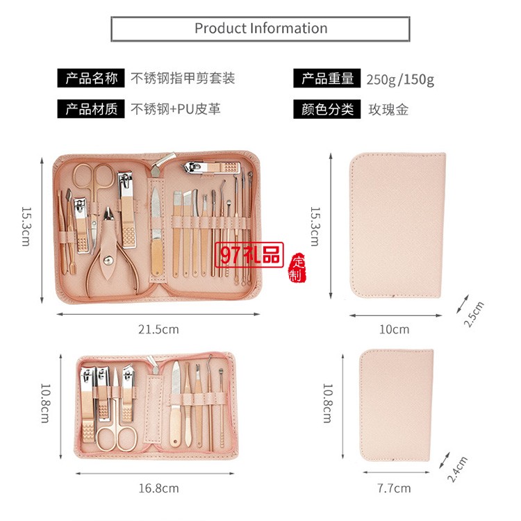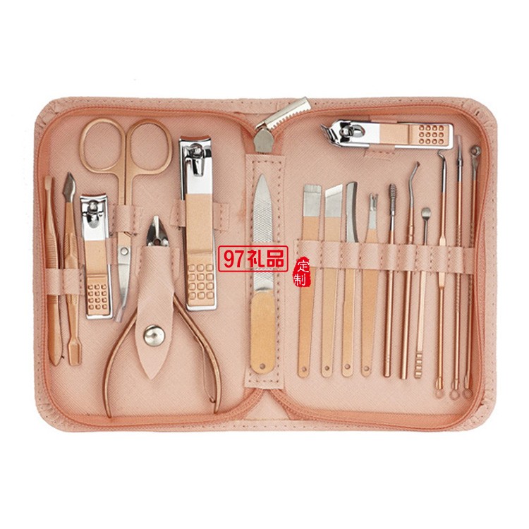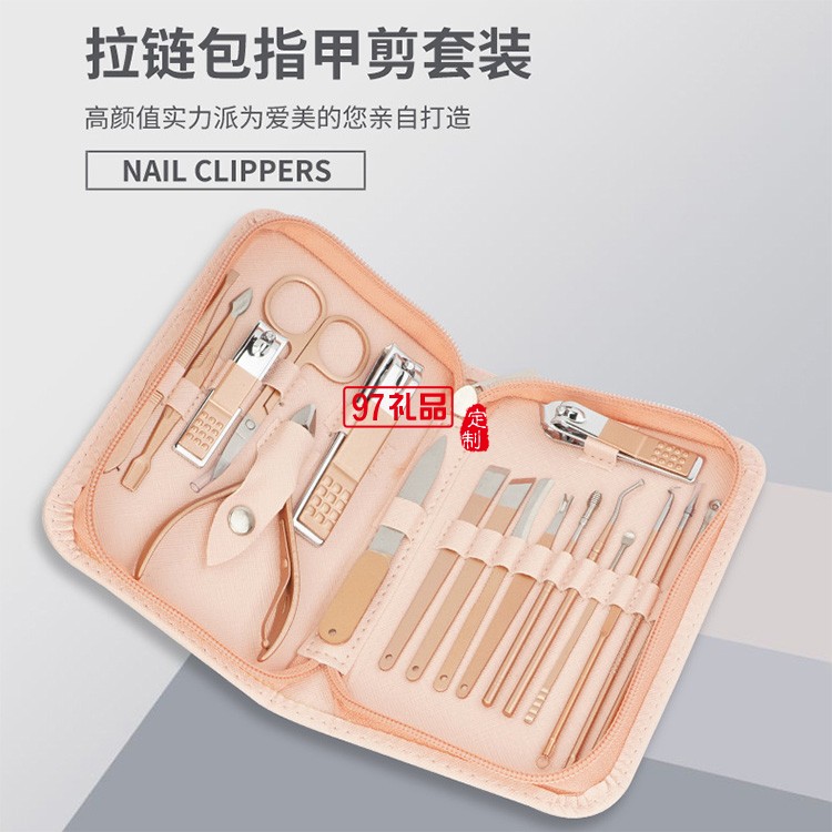 18件套玫瑰金粉色拉鏈包不銹鋼指甲剪美容套裝可定制logo