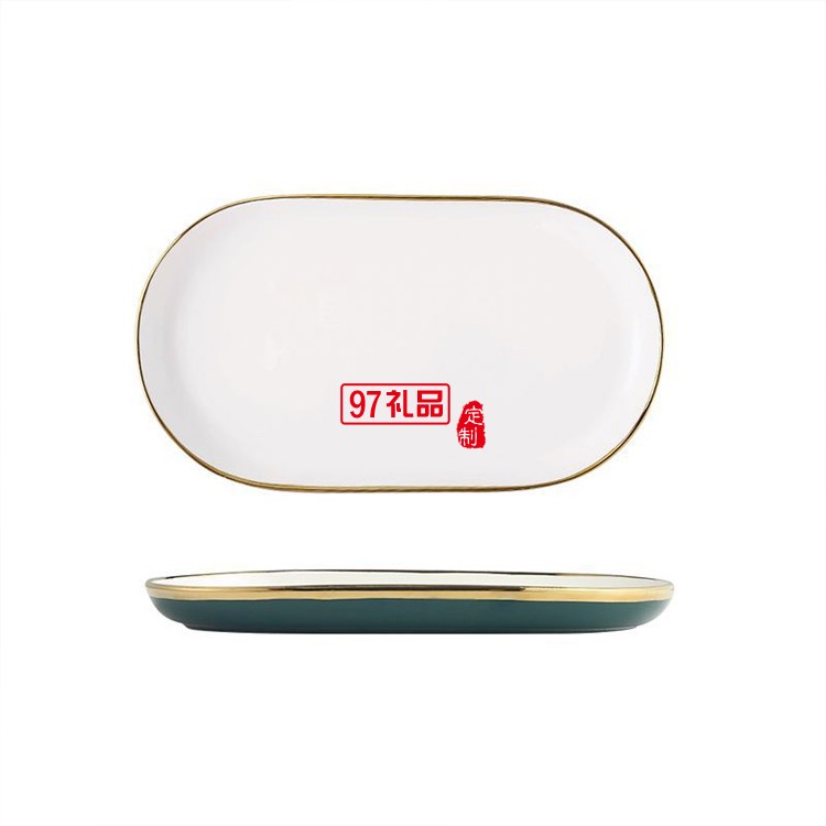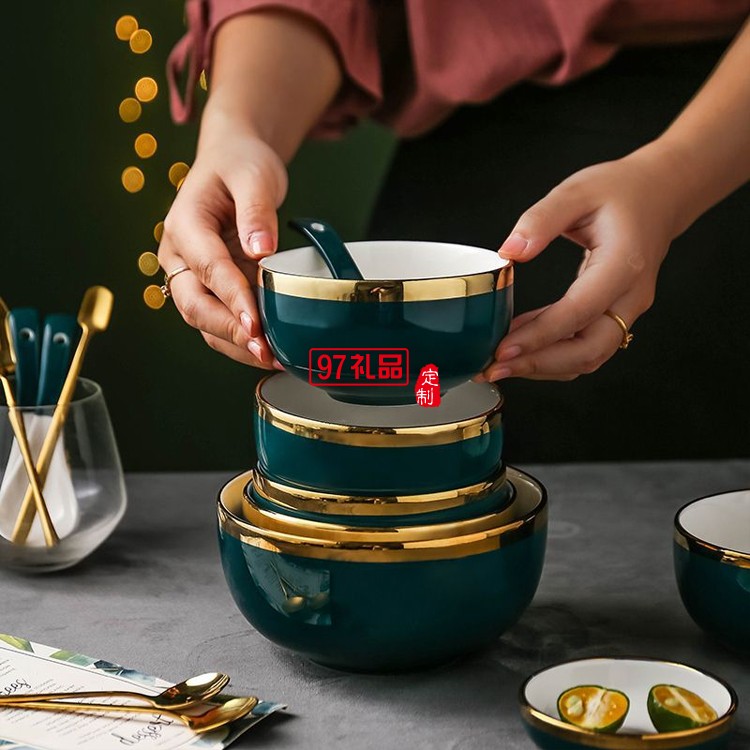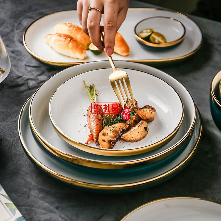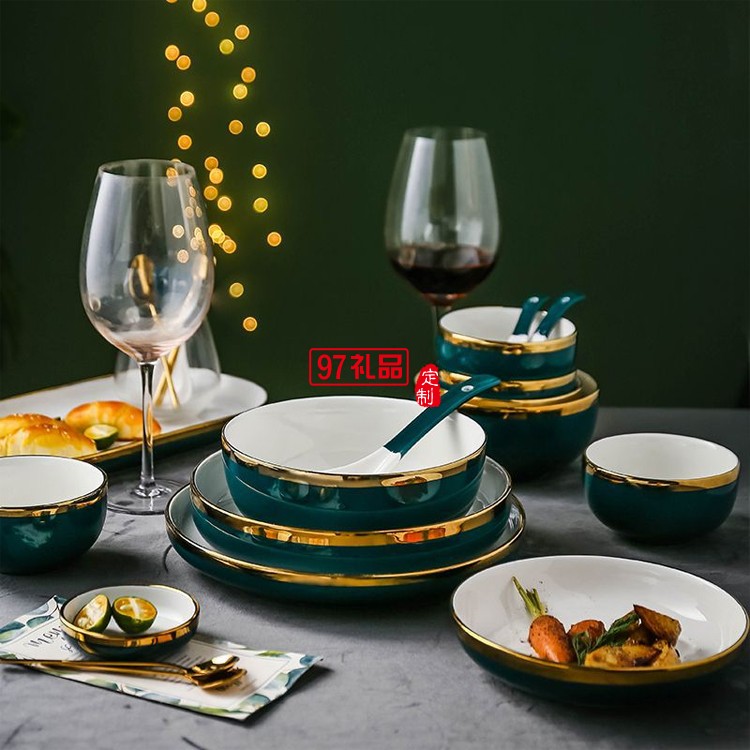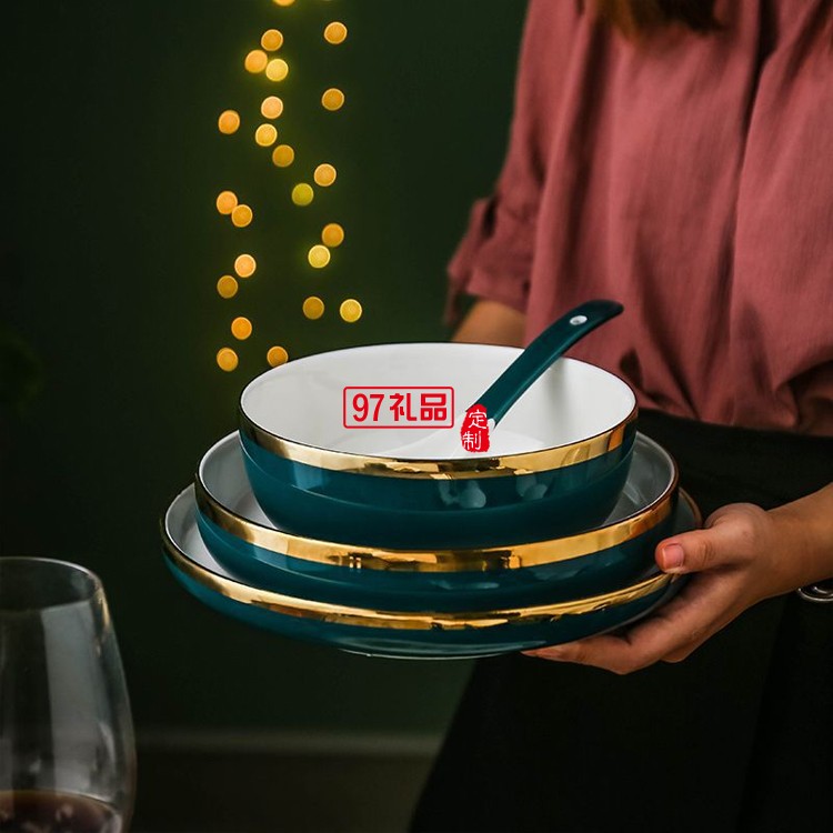 北歐祖母墨綠金邊陶瓷盤碗碟餐具套裝
