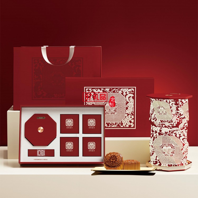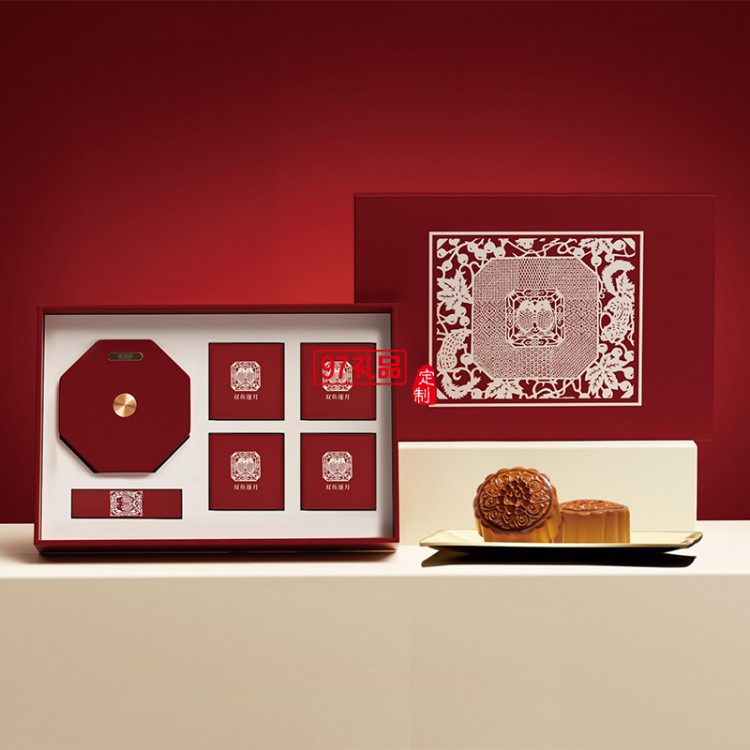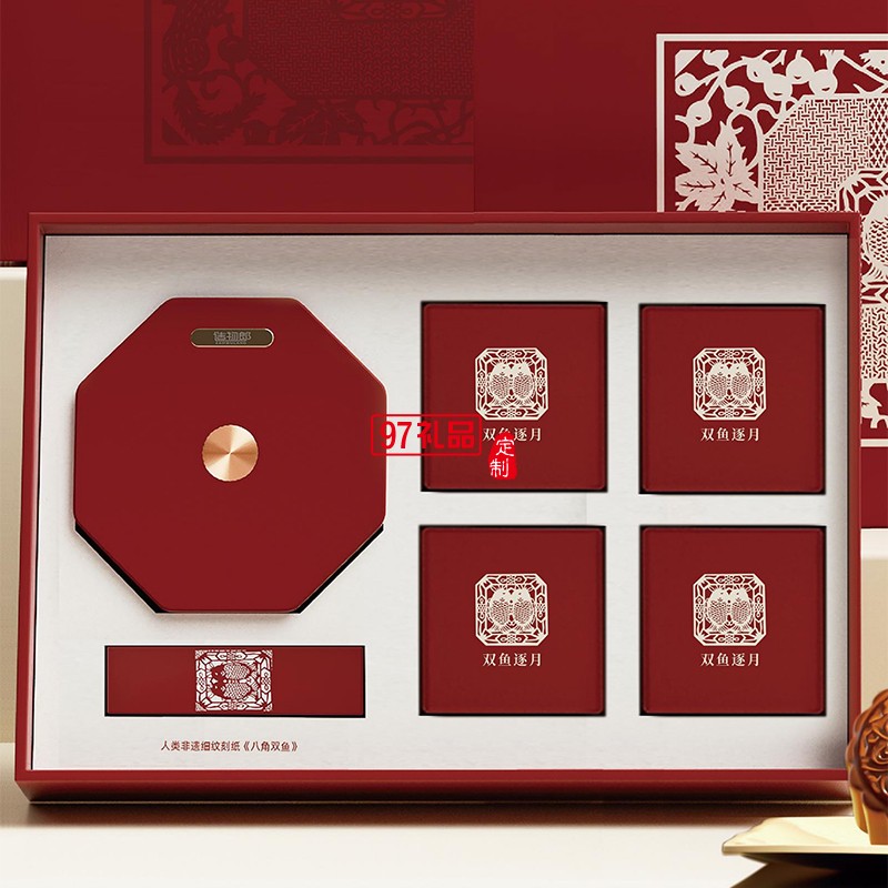 雙魚(yú)逐月細(xì)紋刻紙八角雙魚(yú)旋轉(zhuǎn)燈中秋月餅禮盒