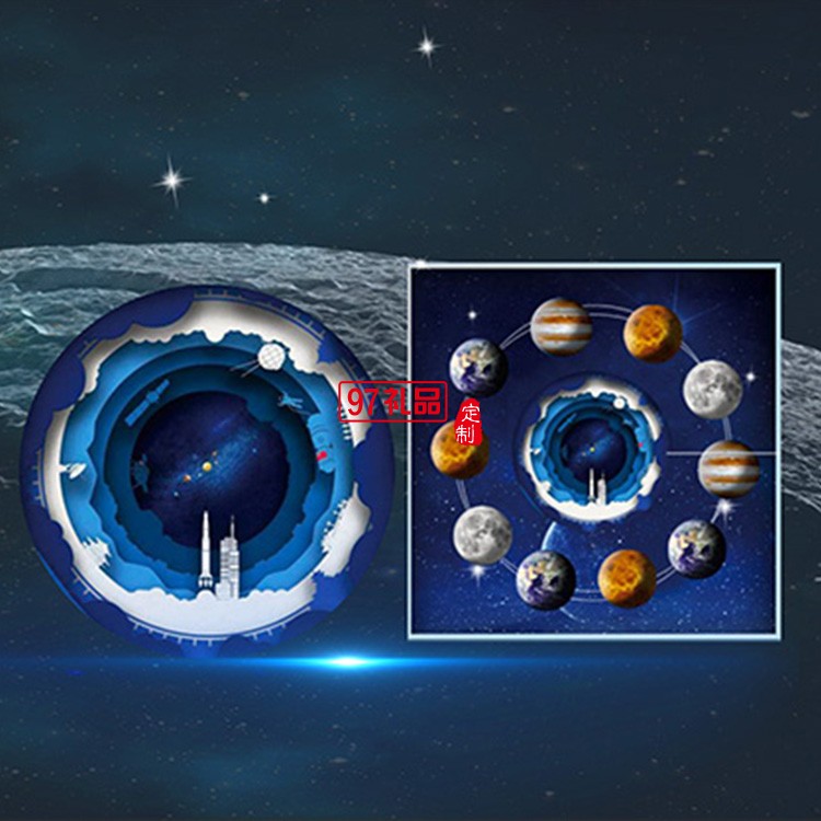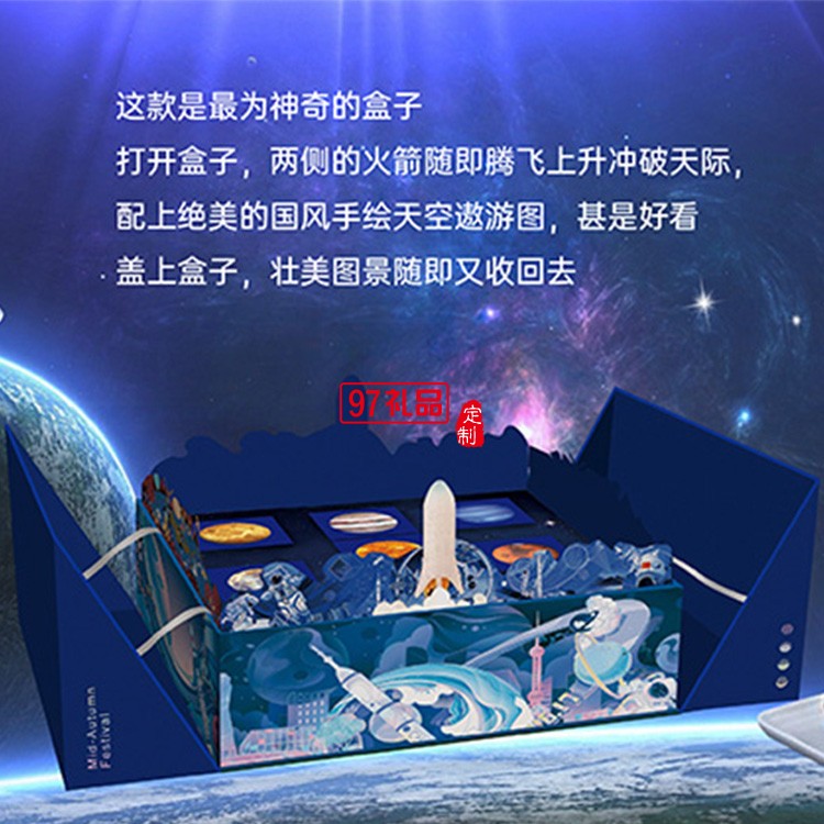 打開盒子,兩側的火箭隨即騰飛上升沖破天際,代表蒸蒸日上,國運恒通